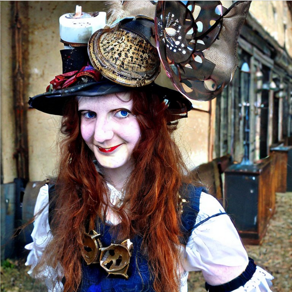 Tout à coup, mon attention est captée par une animation au centre du stand. Une jeune femme, vêtue de la robe bleue caractéristique d'Alice, anime un atelier de création de chapeaux fous. Les participants s'affairent autour d'elle, utilisant des tissus, des plumes et des engrenages pour donner vie à leurs propres créations délirantes.
